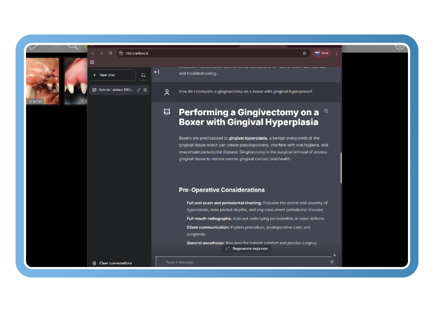 The Clarity Question Lab answers procedural and clinical questions using WSAVA dental guidelines and peer-reviewed material from board-certified veterinary dental specialists. Instant step-by-step explanations support clinical learning and consistency—turning everyday cases into guided, best-practice teaching moments.