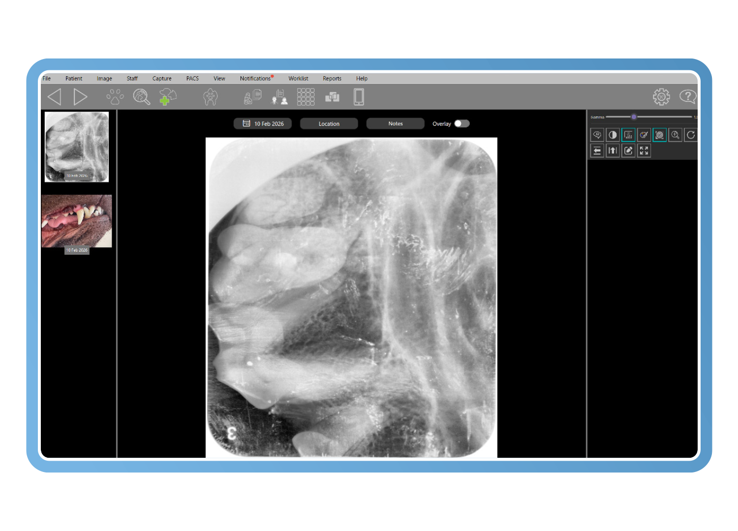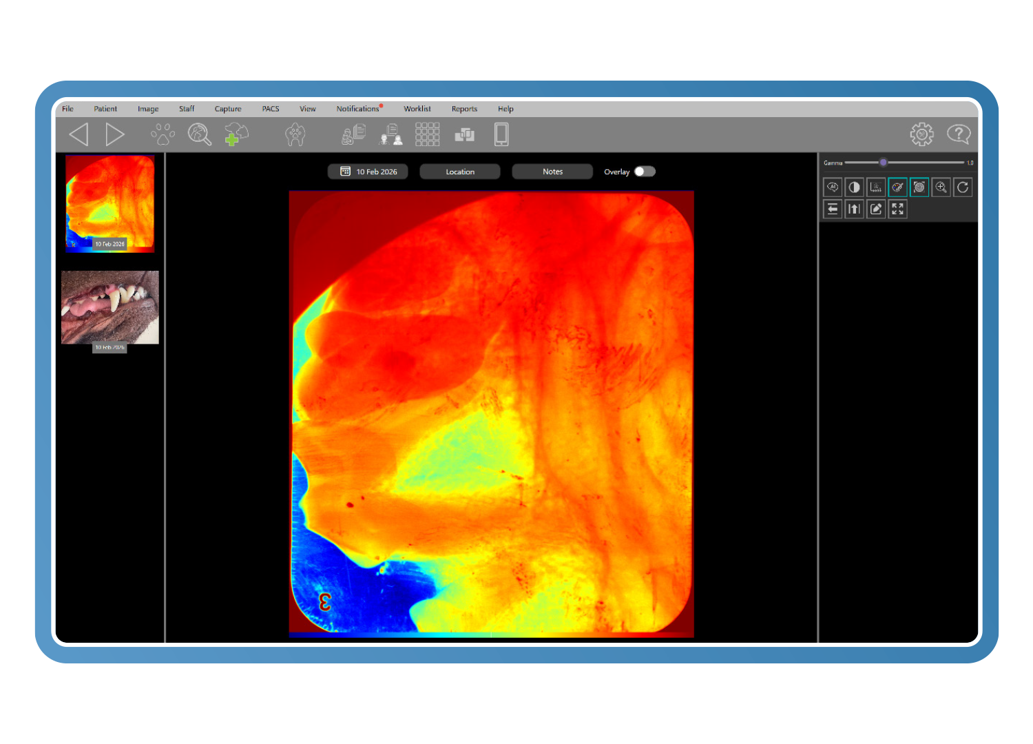 Advanced veterinary imaging tools enhance diagnostic detail even from suboptimal images. Clarity analysis detects changes at just a 2% contrast difference, while smart filters and pseudo-colour visualisation reveal bone loss and periodontal detail — reducing retakes and turning poor-quality images into diagnostic ones.
