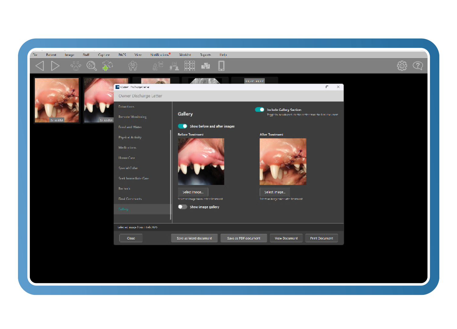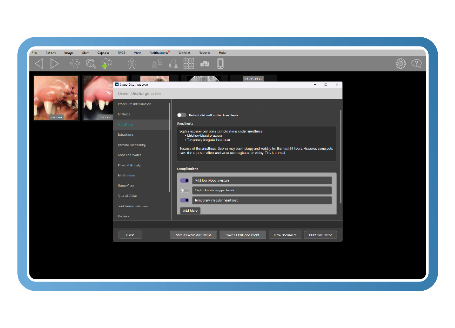 Create customisable discharge letters aligned with AAHA guidelines, including plain-English explanations, before-and-after images, and Clarity assisted content. Built-in remote wound monitoring allows owners to submit images post-treatment, reducing unnecessary rechecks while maintaining clinical oversight.